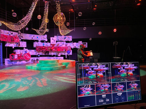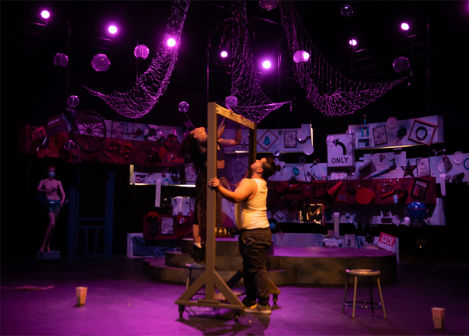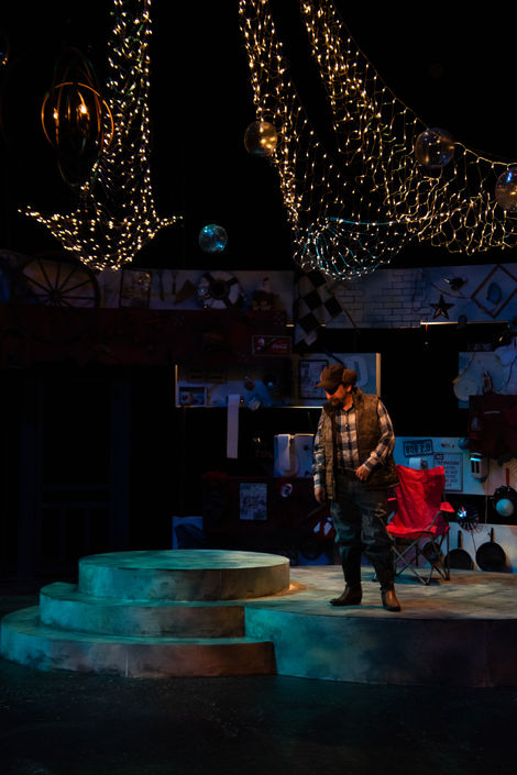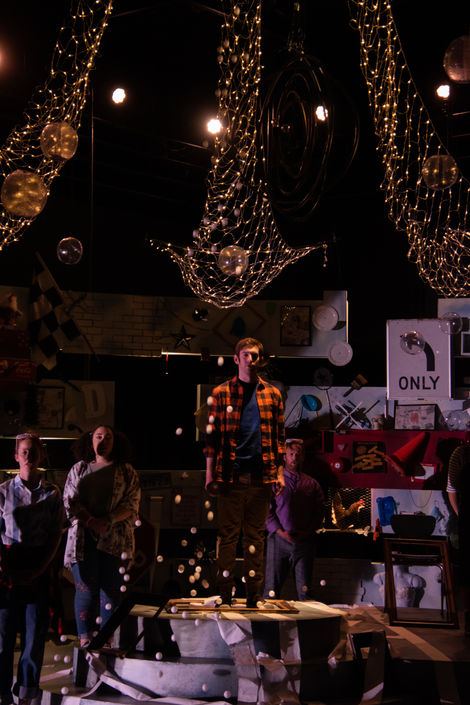 This open-to-reinterpretation script by Charles Mee, originally inspired by the work of Robert Rauschenberg, was reimagined by Director Michael Lugering to reflect the state of America in 2020. The scenic design drew heavily from Rauschenberg’s signature “combine” aesthetic, layering found objects tied to each storyline over a disassembled American flag. A suspended solar system of repurposed junk hung above circular platforms, allowing performers to orbit each other in choreographed distance- reflecting both a key theme of the play and the realities of a socially distanced performance. In lieu of having a live audience the performance was filmed and streamed; some behind-the-scenes content documents the filming process and how the piece was adapted for remote viewing.