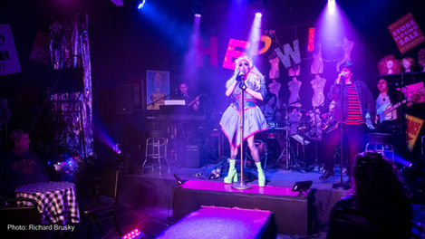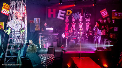 This site-specific production made a tongue-in-cheek transformation of the storefront theatre into a “discount bargain bin” annex of the trendy clothing resale shop next door. The set embraced a maximalist, junkpile aesthetic filled with mannequins, wig heads, and bizarre clothing pieces- anchored by a pink linoleum runway and an onstage dressing room. The HEDWIG letters that hung over the stage were salvaged from defunct neon signage, referencing other businesses in the local arts district and reinforcing the show's themes of self-identity, reinvention, and reclamation.